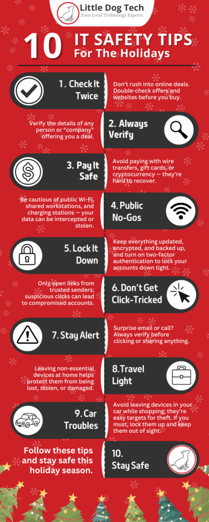 Travelling doesn’t mean you have to leave your tech safety behind. With the right prep and awareness, you can enjoy your holiday without giving hackers or thieves an open invitation. Focus on Travel Tech Safety, follow the simple steps above, and if your device does act strangely when you get home, our team at Little Dog Tech in Urbandale is here to help — from hardware fixes to data protection.